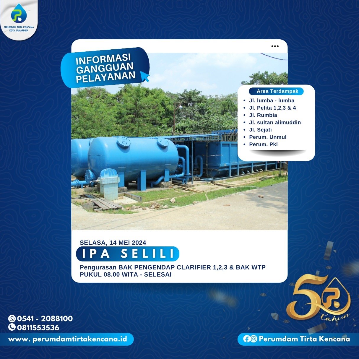 SAMARINDA, cakrawalakaltim.com – Perusahaan Umum Daerah Air Minum (Perumdam) Tirta Kencana Kota Samarinda kembali menjadwalkan pengurasan pada Instalasi Pengolahan Air (IPA) Selili, untuk terus berupaya memberikan pelayanan air bersih yang berkualitas pada Selasa 14 Mei 2024 besok.