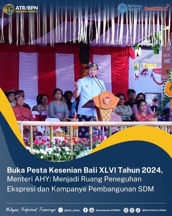 Bali – Menteri Agraria dan Tata Ruang/Kepala Badan Pertanahan Nasional (ATR/BPN), Agus Harimurti Yudhoyono (AHY) berkesempatan membuka Pesta Kesenian Bali (PKB) XLVI Tahun 2024 pada Sabtu (15/06/2024). Saat membuka acara, ia mengatakan bahwa PKB XLVI ini selaras dengan upaya mewujudkan Indonesia Emas 2045.