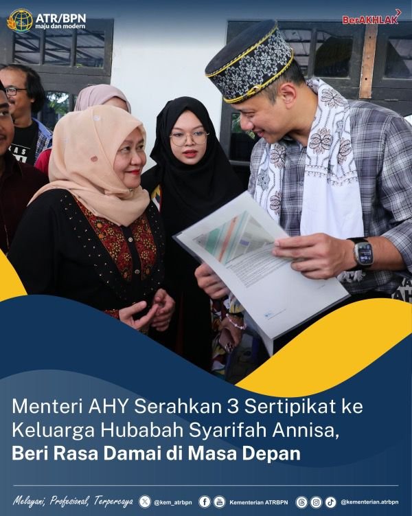 Selain menjalin tali silaturahmi, Menteri ATR/Kepala BPN juga menyerahkan tiga sertipikat kepada anggota keluarga Hubabah Annisa. “Saya sungguh berbahagia bisa hadir secara langsung di sini sekaligus tadi menyerahkan sejumlah sertipikat,” ujarnya.