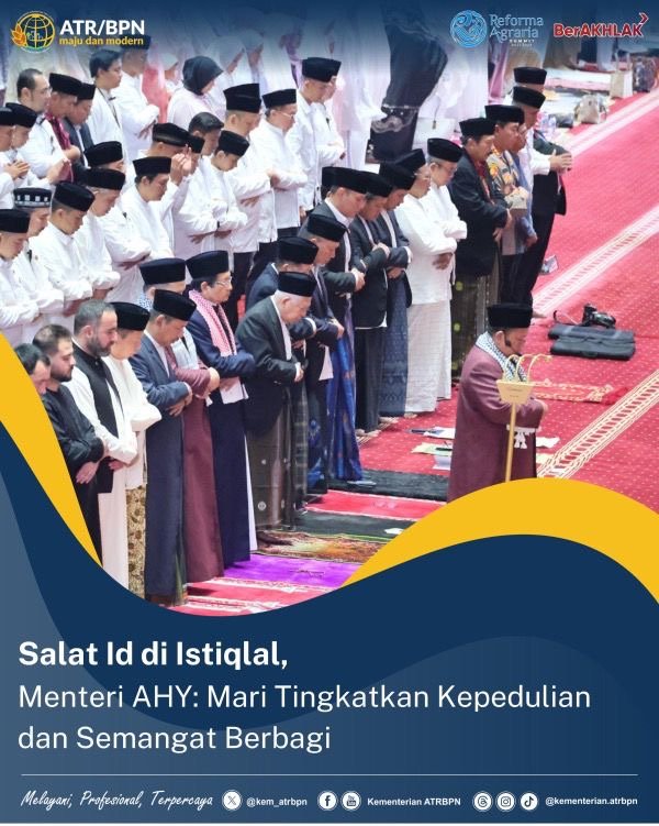 Jakarta – Seusai Salat Iduladha di Masjid Istiqlal pada Senin (17/06/2024) pagi, Menteri Agraria dan Tata Ruang/Kepala Badan Pertanahan Nasional (ATR/BPN) Agus Harimurti Yudhoyono (AHY) mengingatkan kembali kepada masyarakat terkait makna dan esensi Iduladha.