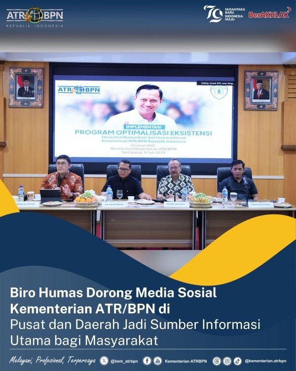 Semarang, Cakrawalakaltim.com – Kementerian Agraria dan Tata Ruang/Badan Pertanahan Nasional (ATR/BPN) melalui Biro Hubungan Masyarakat (Humas) melaksanakan EKSISTENSI atau Ekosistem Komunikasi dan Humas Internal baik pusat maupun daerah. Sebanyak total 512 satuan kerja (Satker) diberikan amanah untuk menjalankan strategi utama EKSISTENSI, yakni One Day One Media, One Day One Post, dan One Satker One Media.
