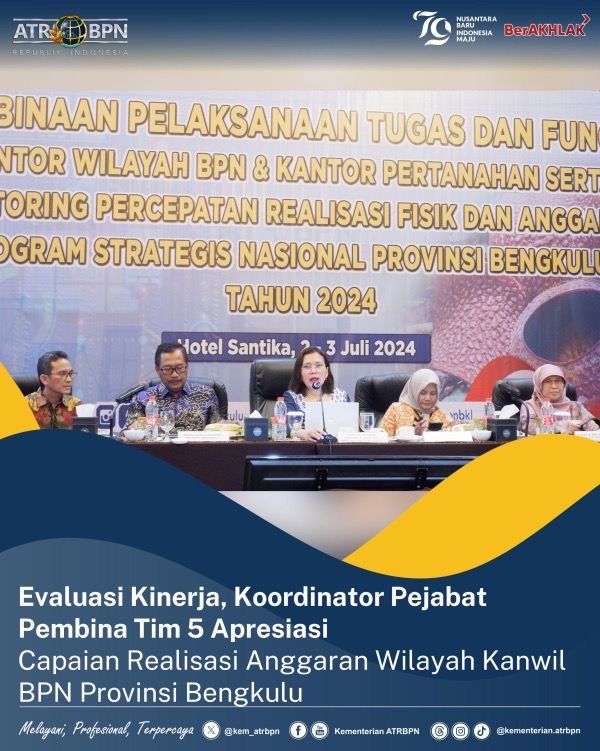 Bengkulu, Cakrawalakaltim.com – Kementerian Agraria dan Tata Ruang/Badan Pertanahan Nasional (ATR/BPN) melakukan evaluasi dan pembinaan terhadap kinerja Kantor Wilayah (Kanwil) BPN dan Kantor Pertanahan (Kantah) di Provinsi Bengkulu. Kegiatan berlangsung di Hotel Santika Kota Bengkulu pada Selasa (02/07/2024).