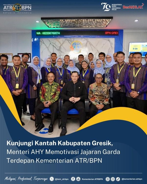 Tak hanya meninjau langsung layanan pertanahan yang ada di Kantah Kabupaten Gresik, kehadiran Menteri AHY juga sebagai bentuk motivasi dan pemberian semangat kepada jajaran yang menjadi garda terdepan memberikan layanan kepada masyarakat.