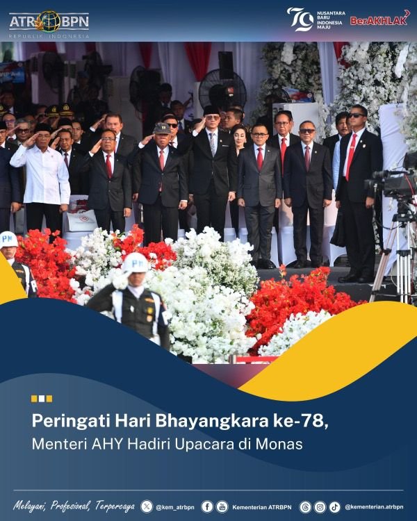 Jakarta, Cakrawalakaltim.com – Menteri Agraria dan Tata Ruang/Kepala Badan Pertanahan Nasional (ATR/BPN) Agus Harimurti Yudhoyono (AHY) menghadiri Upacara dan Syukuran Hari Bhayangkara ke-78 di Lapangan Silang Monas, Senin (01/07/2024). Upacara ini dipimpin langsung oleh Presiden Republik Indonesia (RI), Joko Widodo.