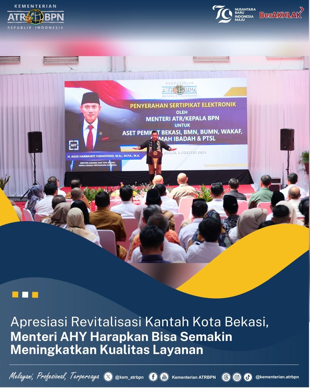 “Saya senang karena datang disuguhi dengan kantor yang semakin apik, semakin modern karena baru saja dilakukan revitalisasi. Bukan hanya secara estetika lebih baik, lebih modern, tapi juga fungsi pelayanan, loket-loket pelayanan yang ada di lobi Kantah Kota Bekasi ini mudah-mudahan semakin menunjukkan profesionalisme untuk melayani masyarakat dalam berbagai urusan pertanahan dan tata ruang,” ujar Menteri AHY.