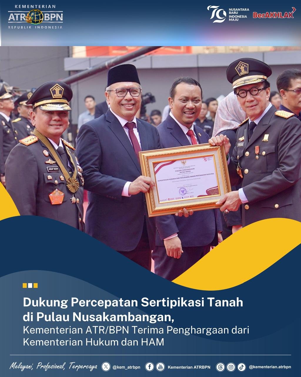 Penghargaan diserahkan oleh Menteri Hukum dan HAM, Yasonna H. Laoly karena Kementerian ATR/BPN telah mendukung percepatan sertipikasi aset Kementerian Hukum dan HAM di Pulau Nusakambangan. Bersamaan dengan ini, Sekjen Kementerian ATR/BPN menyerahkan 35 Sertipikat Hak Pakai Pulau Nusakambangan seluas 75.040.780 meter persegi dari total luas tanah 120.568.000 meter persegi.