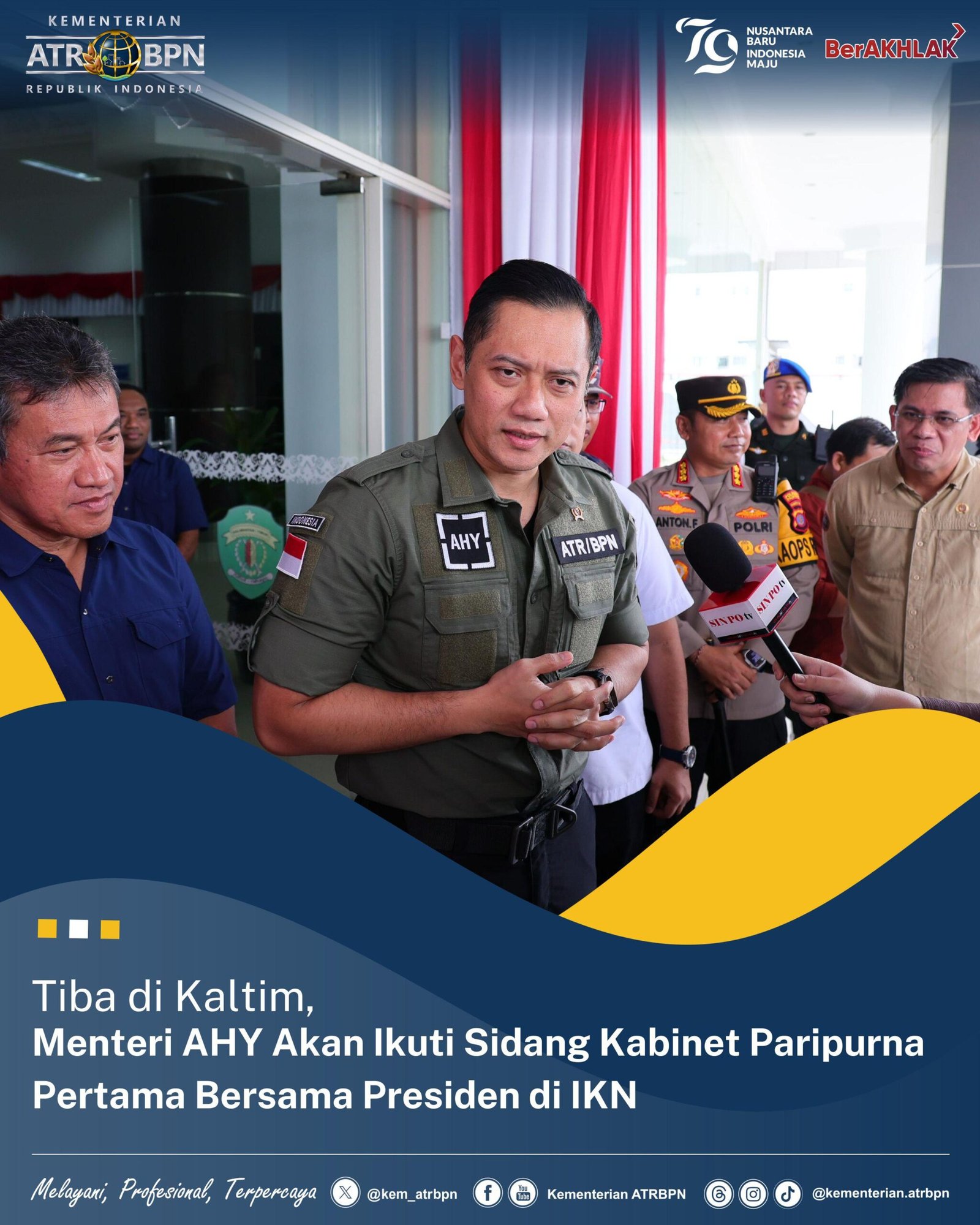 “Secara khusus, besok kita akan mengikuti Sidang Kabinet Paripurna pertama yang dipimpin langsung oleh Bapak Presiden Joko Widodo, yang menghadirkan seluruh anggota kabinet pertama kalinya di IKN. Tentunya ini akan menjadi momen yang penting dan bersejarah,” ujar Menteri AHY setibanya di Bandar Udara Internasional Sepinggan, Kota Balikpapan.