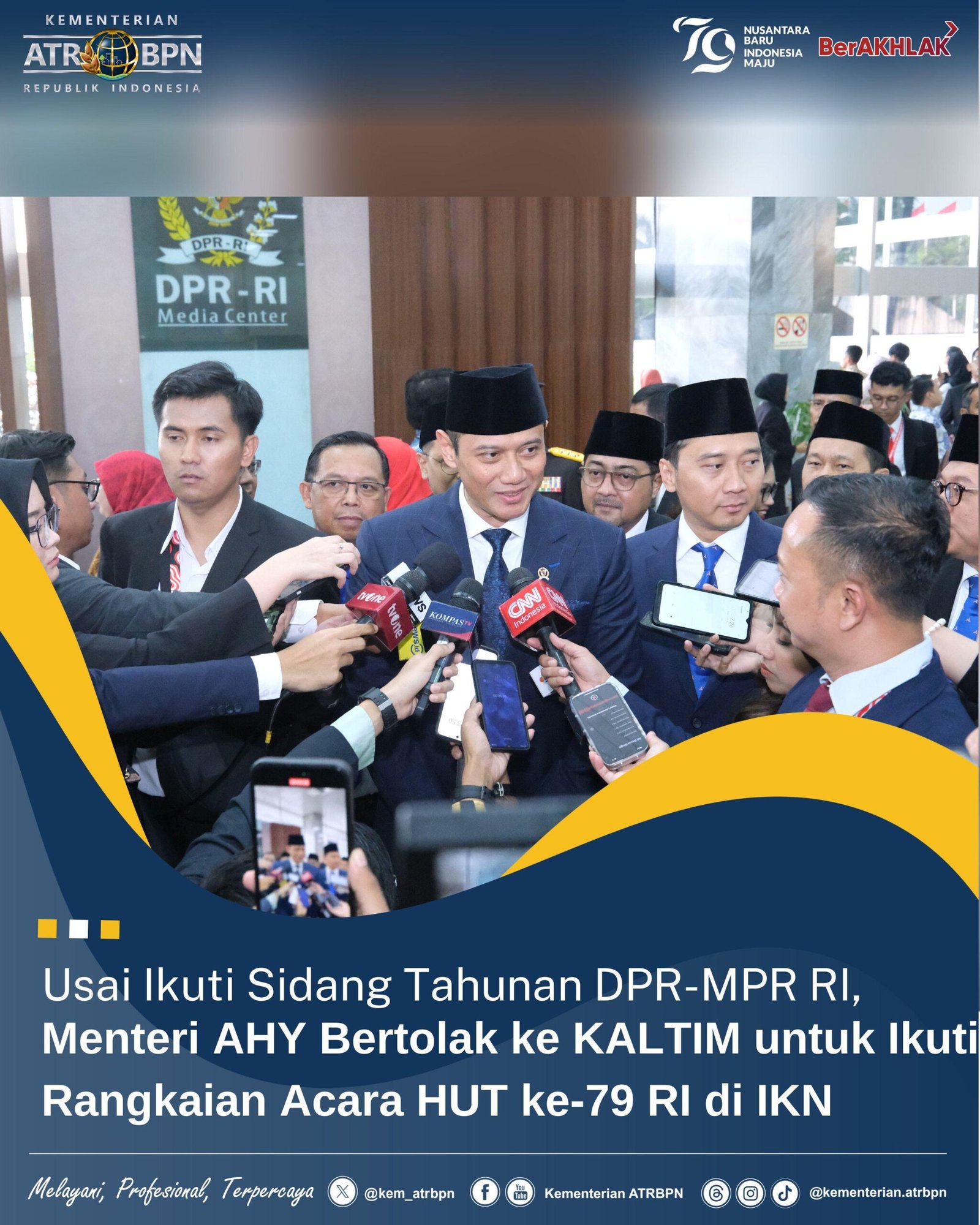 Jakarta, Cakrawalakaltim.com – Usai mengikuti Sidang Tahunan MPR RI dan Sidang Bersama DPR RI-DPD RI Tahun 2024 di Jakarta pada Jumat (16/08/2024), Menteri Agraria dan Tata Ruang/Kepala Badan Pertanahan Nasional (ATR/BPN), Agus Harimurti Yudhoyono (AHY) bertolak menuju Kalimantan Timur (Kaltim), tepatnya Kota Balikpapan. Kunjungannya kali ini, dalam rangka mengikuti rangkaian Hari Ulang Tahun (HUT) ke-79 Kemerdekaan Republik Indonesia di Ibu Kota Nusantara (IKN).