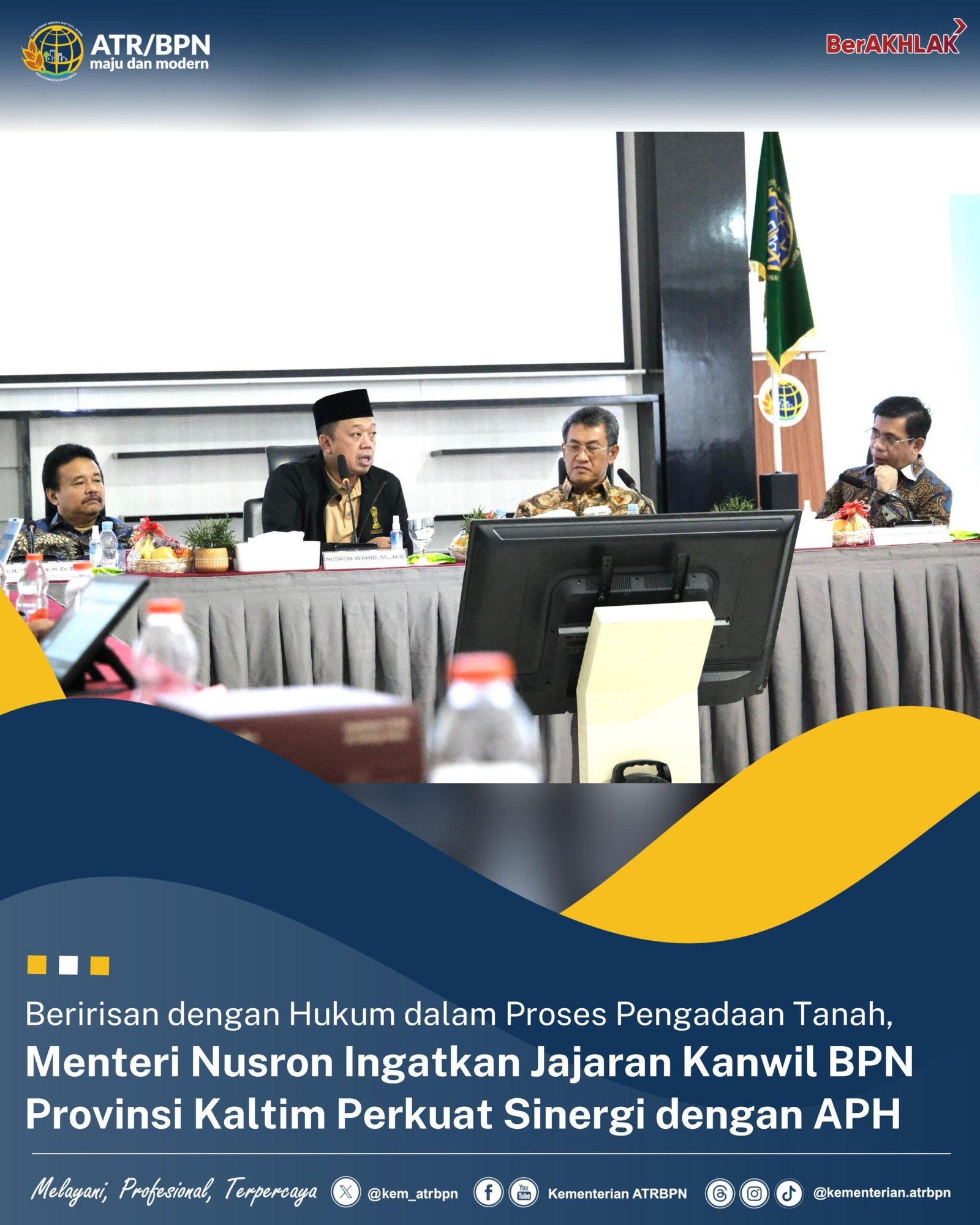 Menteri ATR/Kepala BPN, Nusron Wahid mengatakan, proses pengadaan tanah ini umumnya beririsan dengan hukum. Oleh sebab itu, ia mengingatkan jajarannya untuk memperkuat sinergi dengan aparat penegak hukum (APH).