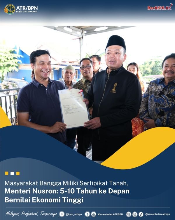 Balikpapan – Menteri Agraria dan Tata Ruang/Kepala Badan Pertanahan Nasional (ATR/BPN), Nusron Wahid menyampaikan bahwa sertipikat tanah dapat meningkatkan nilai ekonomi masyarakat. Untuk itu, masyarakat diimbau agar segera mendaftarkan tanahnya melalui Kantor Pertanahan setempat.