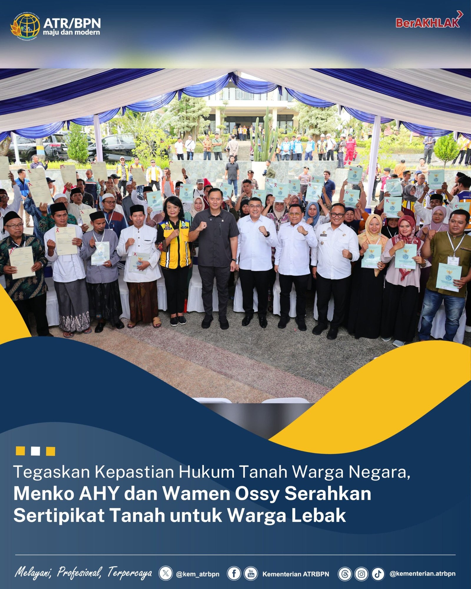 Pada kesempatan tersebut, diserahkan 20 sertipikat tanah hasil program Pendaftaran Tanah Sistematis Lengkap (PTSL) kepada masyarakat Kabupaten Lebak, serta 14 sertipikat tanah wakaf yang diperuntukkan bagi rumah ibadah, organisasi umat Muslim, dan pondok pesantren di Kabupaten Lebak dan Kota Serang.