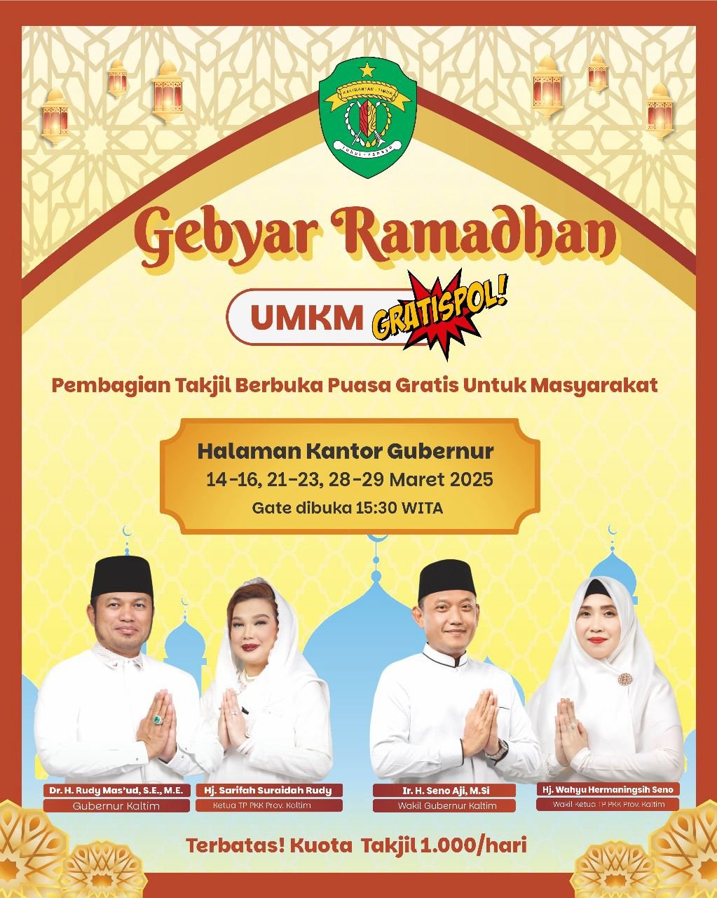 Kegiatan yang digelar oleh Dinas Perindustrian Perdagangan Koperasi dan Usaha Kecil Menengah (DPPKUKM) Kaltim ini bertujuan untuk meningkatkan permintaan produk UKM, sekaligus memberikan manfaat bagi masyarakat yang menjalankan ibadah puasa. Selama delapan hari, yakni pada 14-16 Maret, 21-23 Maret, serta 28-29 Maret 2025, sebanyak 120 UKM binaan dilibatkan dalam penyediaan takjil. Setiap harinya, 1.000 paket berisi makanan dan minuman produksi UKM dibagikan di halaman Kantor Gubernur Kaltim, Jalan Gadjah Mada, Samarinda.