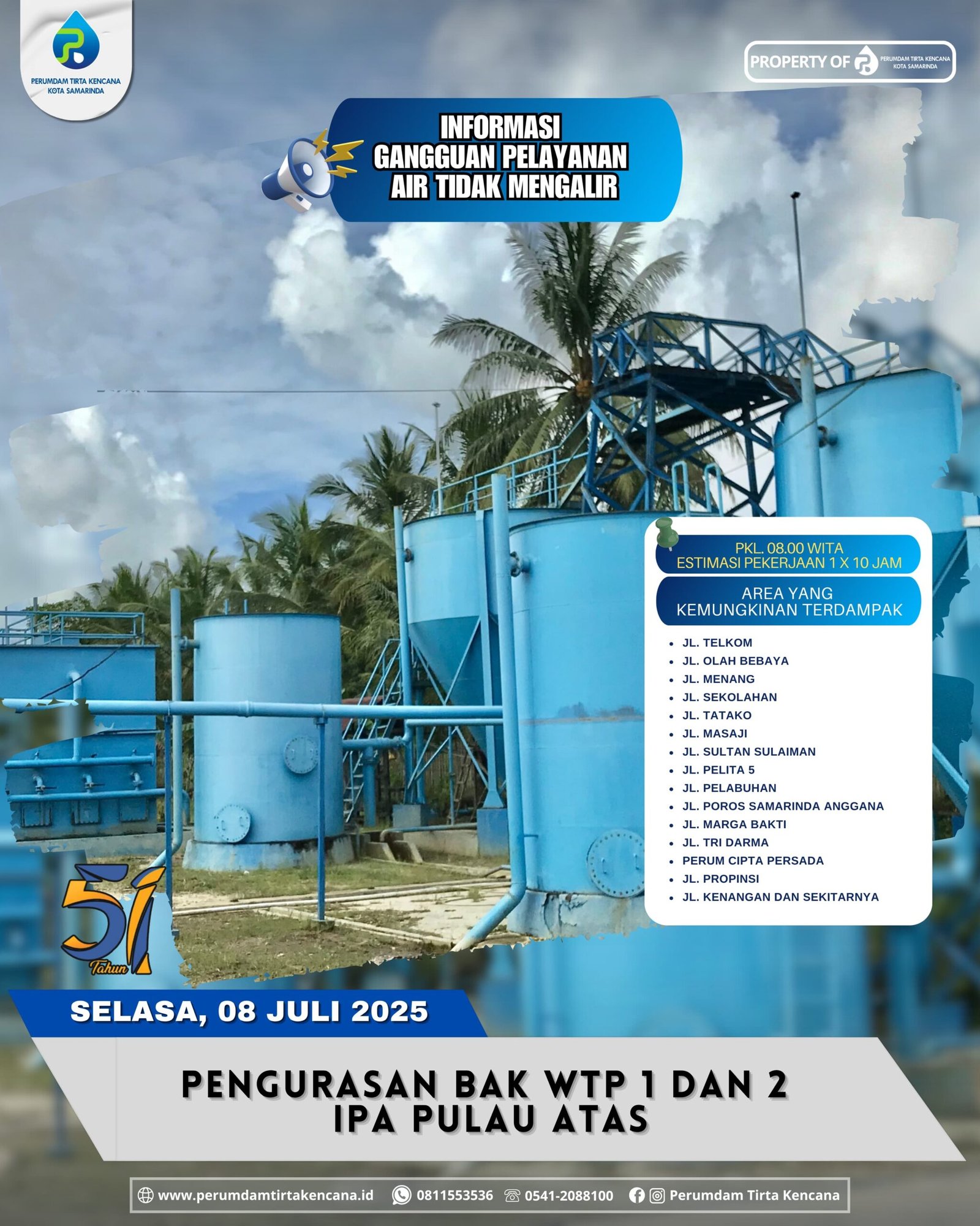 SAMARINDA, Cakrawalakaltim.com — Perusahaan Umum Daerah Air Minum (Perumdam) Tirta Kencana Kota Samarinda kembali melakukan langkah pemeliharaan rutin demi menjamin kualitas layanan air bersih bagi masyarakat. Pada Selasa, 8 Juli 2025, perusahaan akan melakukan pengurasan bak WTP 1 dan 2 di Instalasi Pengolahan Air (IPA) Pulau Atas, yang berdampak pada terhentinya aliran air ke sejumlah wilayah di kota Samarinda.