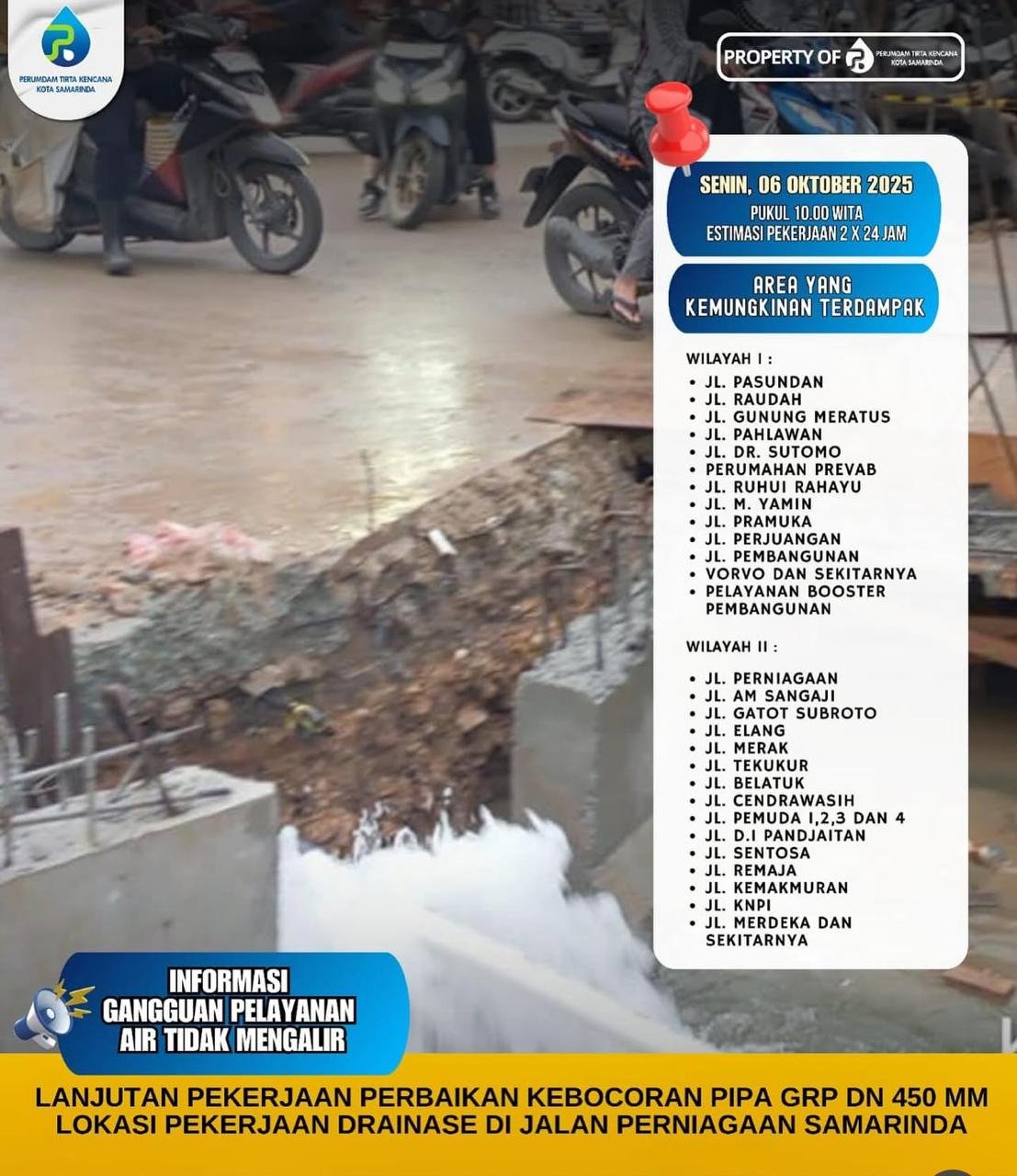 SAMARINDA, cakrawalakaltim.com — Perumdam Tirta Kencana Samarinda mengimbau pelanggan di wilayah terdampak untuk menyiapkan tampungan air secukupnya dan menggunakan air secara bijak. Imbauan ini terkait pekerjaan perbaikan kebocoran Pipa GRP DN 450 mm yang berlangsung di Jl. Perniagaan, Samarinda, mulai Senin, 6 Oktober 2025 pukul 10.00 WITA, dengan estimasi penyelesaian 2 x 24 jam.