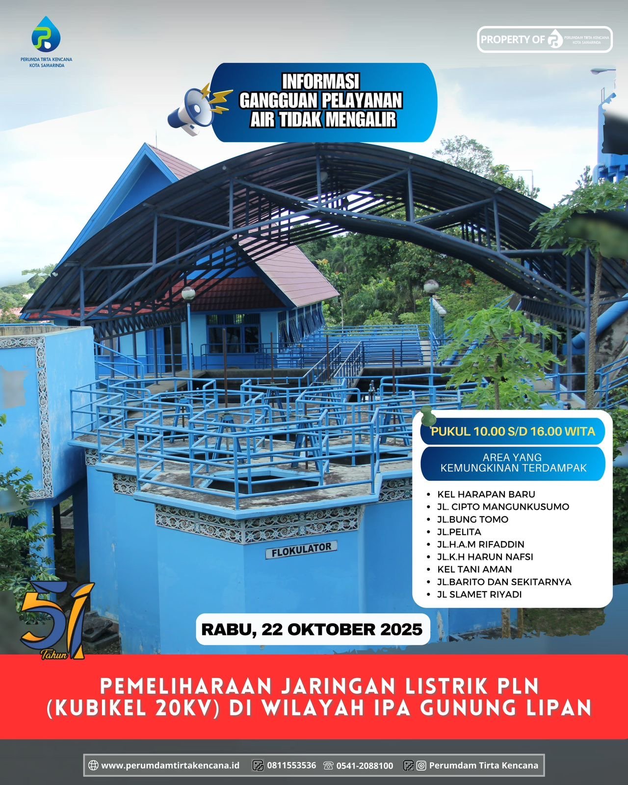 SAMARINDA, cakrawalakaltim.com – Perusahaan Umum Daerah Air Minum (Perumdam) Tirta Kencana Kota Samarinda mengimbau pelanggan di wilayah terdampak untuk menyiapkan tampungan air secukupnya dan menggunakan air secara bijak, menyusul adanya kegiatan pemeliharaan jaringan listrik PLN (Kubikel 20 kV) di wilayah Instalasi Pengolahan Air (IPA) Gunung Lipan, pada Rabu, 22 Oktober 2025.
