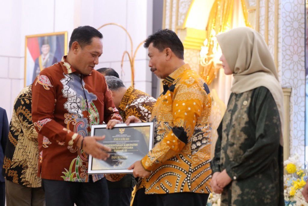 Bupati Kukar, Aulia Rahman Basri, yang diwakili oleh Sekretaris Daerah (Sekda) Sunggono, menerima langsung piala dan sertifikat penghargaan dari Wakil Gubernur Kaltim, Seno Aji, didampingi Ketua Komisi Informasi (KI) Pusat, Donny Yoesgiantoro.