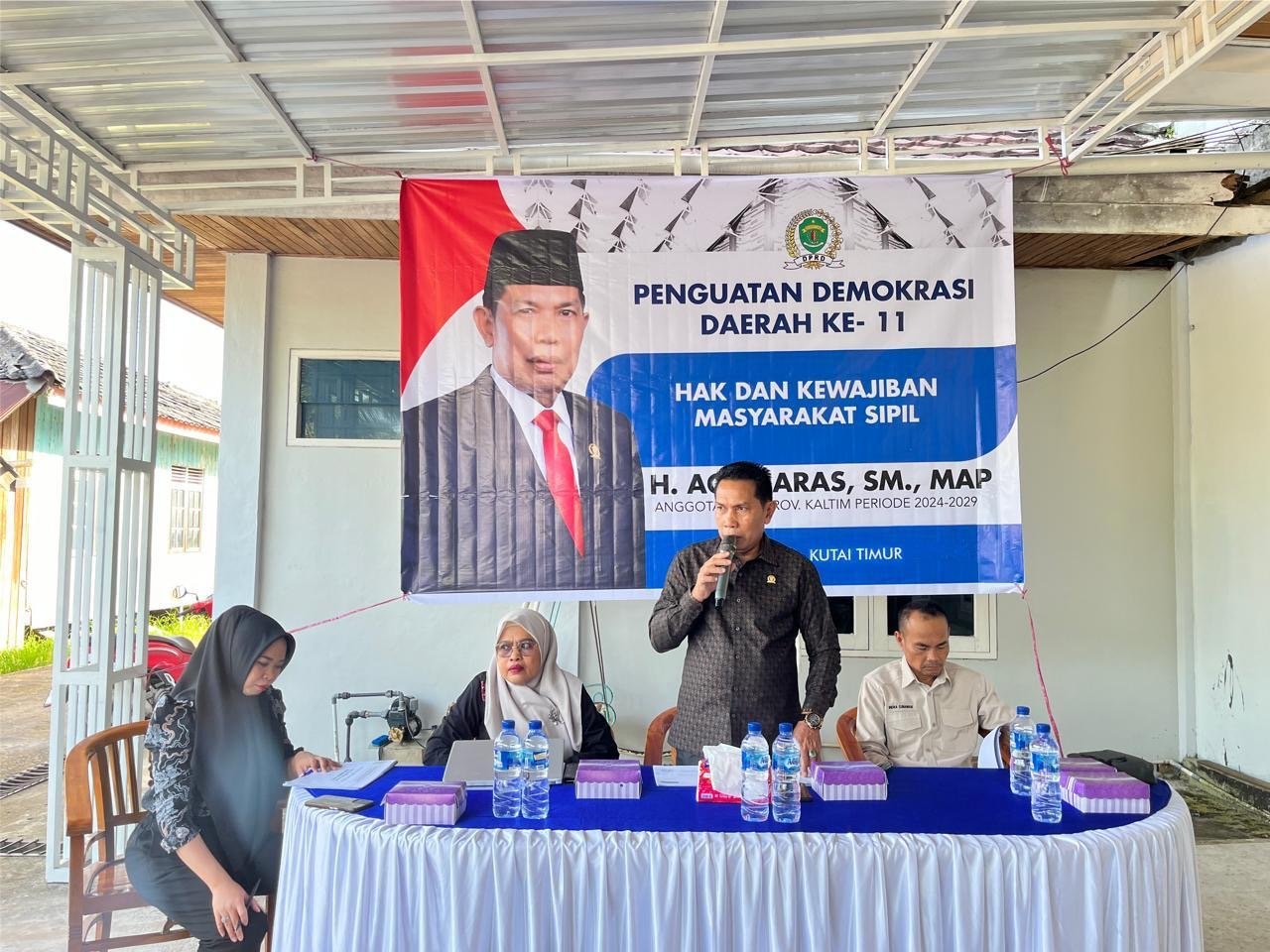 SANGATTA, Cakrawalakaltim.com – Penguatan peran masyarakat dalam sistem demokrasi kembali menjadi sorotan pada agenda Penguatan Demokrasi Daerah ke-11 yang digelar di RT 59 Sangatta Utara, Kamis (27/11/2025). Anggota Komisi IV DPRD Kaltim sekaligus Ketua Fraksi Demokrat–PPP, Agus Aras, menegaskan pentingnya pemahaman masyarakat sipil terhadap hak dan kewajiban mereka dalam kehidupan bernegara.