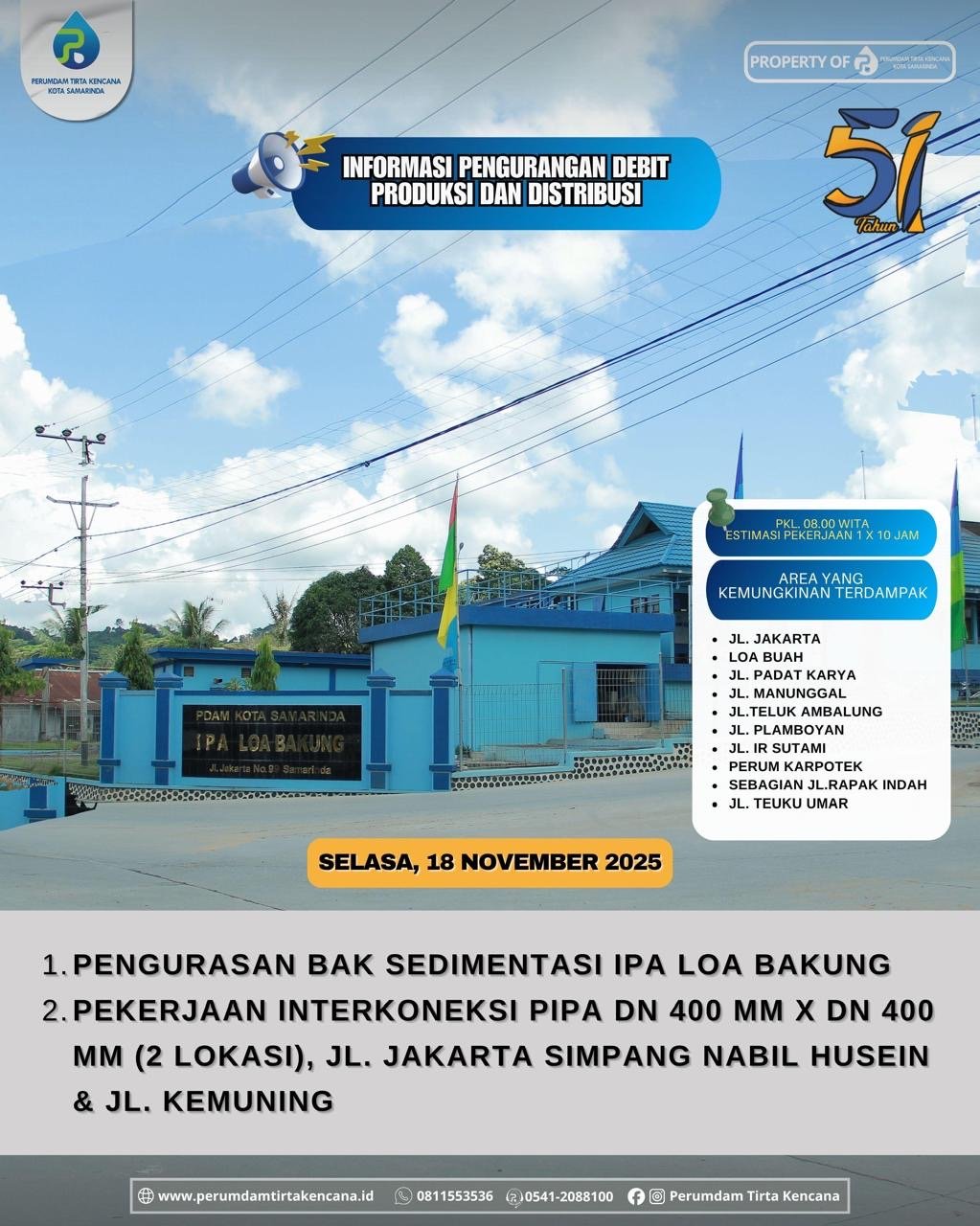 Pekerjaan tersebut meliputi pengurasan bak sedimentasi IPA Loa Bakung serta interkoneksi pipa berdiameter 400 mm di dua lokasi, yaitu Jalan Jakarta simpang Nabil Husein dan Jalan Kemuning. Pekerjaan dimulai pukul 08.00 Wita dengan estimasi durasi 1×10 jam.