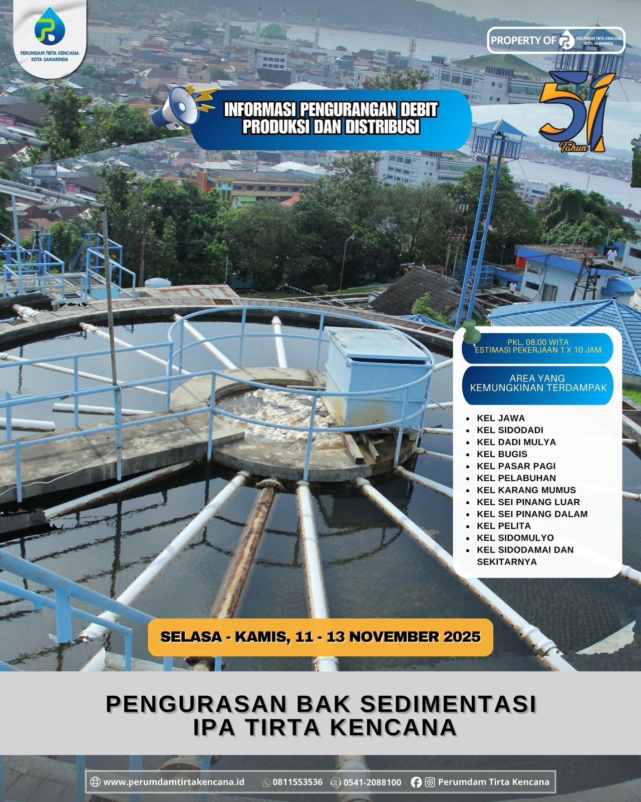SAMARINDA, Cakrawalakaltim.com — Perusahaan Umum Daerah Air Minum (Perumdam) Tirta Kencana Samarinda akan melakukan pekerjaan pengurasan bak sedimentasi di Instalasi Pengolahan Air (IPA) Cendana mulai Selasa hingga Kamis, 11—13 November 2025, sebagai bagian dari upaya pemeliharaan kualitas dan kontinuitas layanan bagi pelanggan.