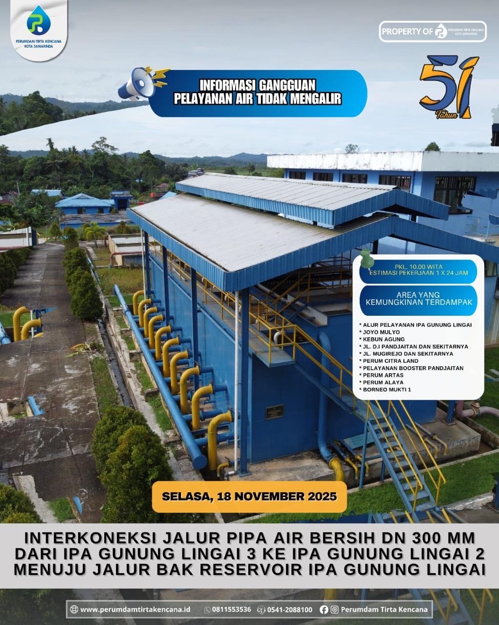 Perusahaan Umum Daerah Air Minum (Perumdam) Tirta Kencana Kota Samarinda menginformasikan adanya gangguan layanan distribusi air bersih pada Selasa, 18 November 2025, akibat pekerjaan interkoneksi jalur pipa air bersih DN 300 mm dari IPA Gunung Lingai 3 ke IPA Gunung Lingai 2 menuju jalur bak reservoir IPA Gunung Lingai.