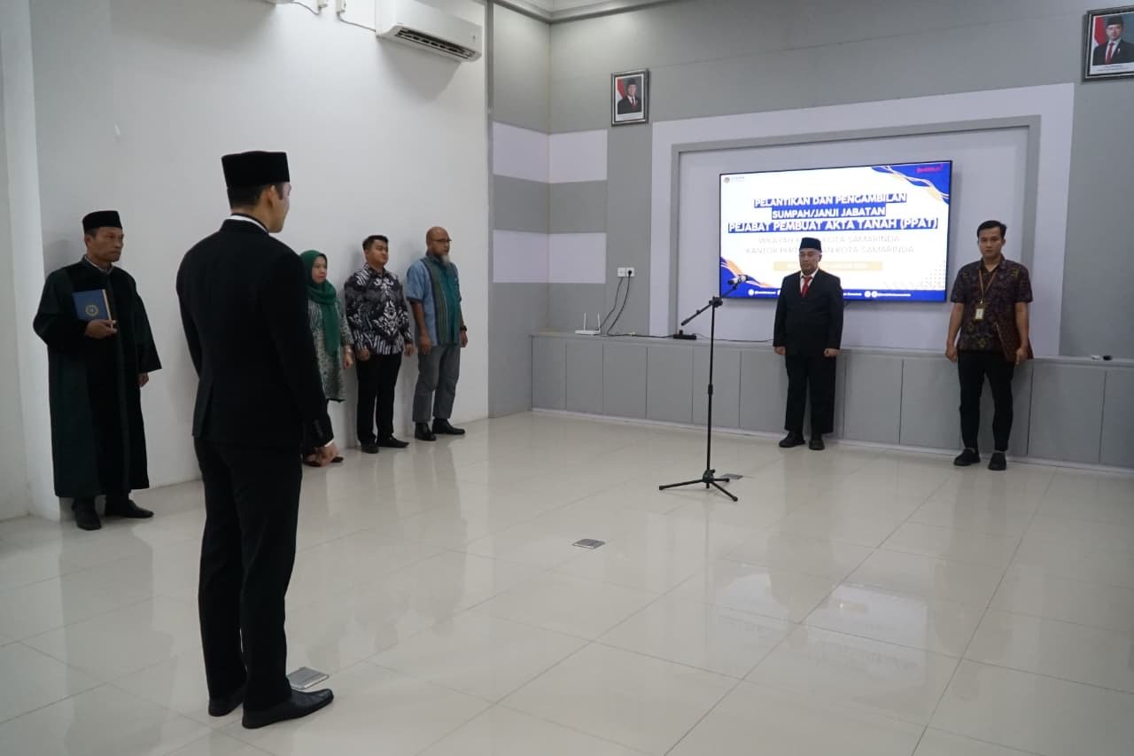 Samarinda, Cakrawalakaltim.com — Kantor Pertanahan Kota Samarinda melaksanakan pelantikan dan pengambilan sumpah Pejabat Pembuat Akta Tanah (PPAT), yang digelar di ruang rapat Kantor Pertanahan Kota Samarinda, Kamis (15/1/2026). Pada kesempatan ini, PPAT yang dilantik adalah Handriyan. Kegiatan ini merupakan bagian dari amanat peraturan perundang-undangan sekaligus wujud pembinaan awal bagi PPAT yang akan mengemban tugas pelayanan publik di bidang pertanahan.