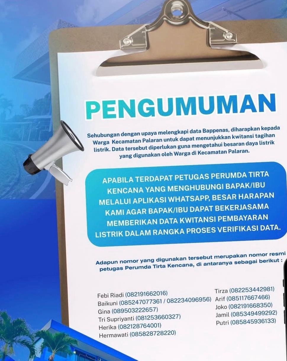 Sebagai bentuk transparansi dan edukasi kepada masyarakat, Perumda Tirta Kencana menyampaikan daftar nomor WhatsApp resmi petugas yang melakukan verifikasi data, sebagai berikut: