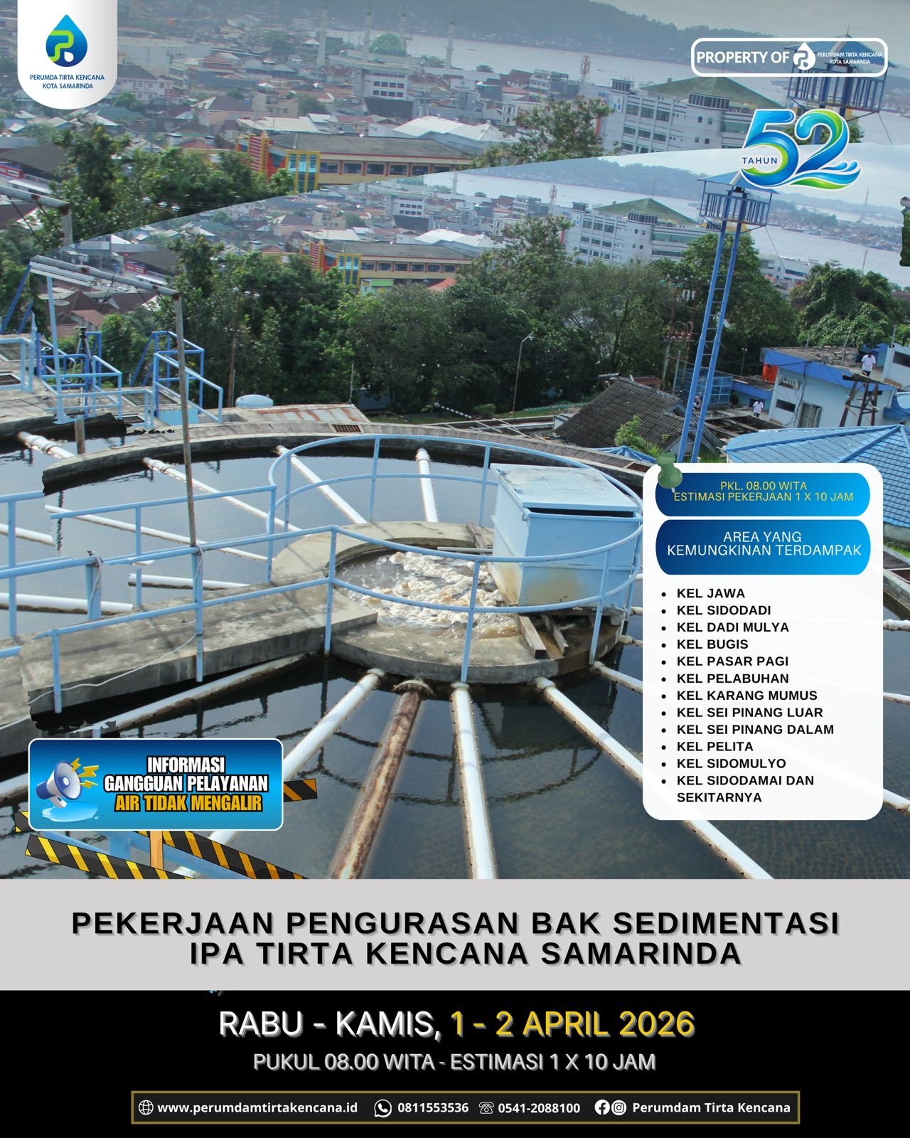 Untuk informasi dan pengaduan, masyarakat dapat menghubungi Contact Center Perumda Tirta Kencana di (0541) 2088100 atau melalui WhatsApp di 0811 553 536.